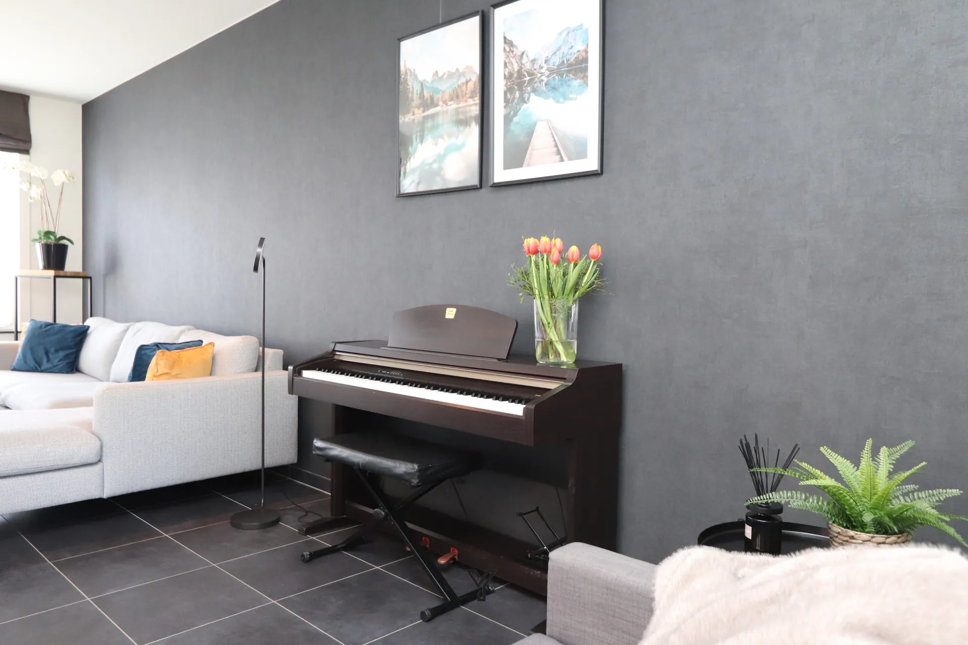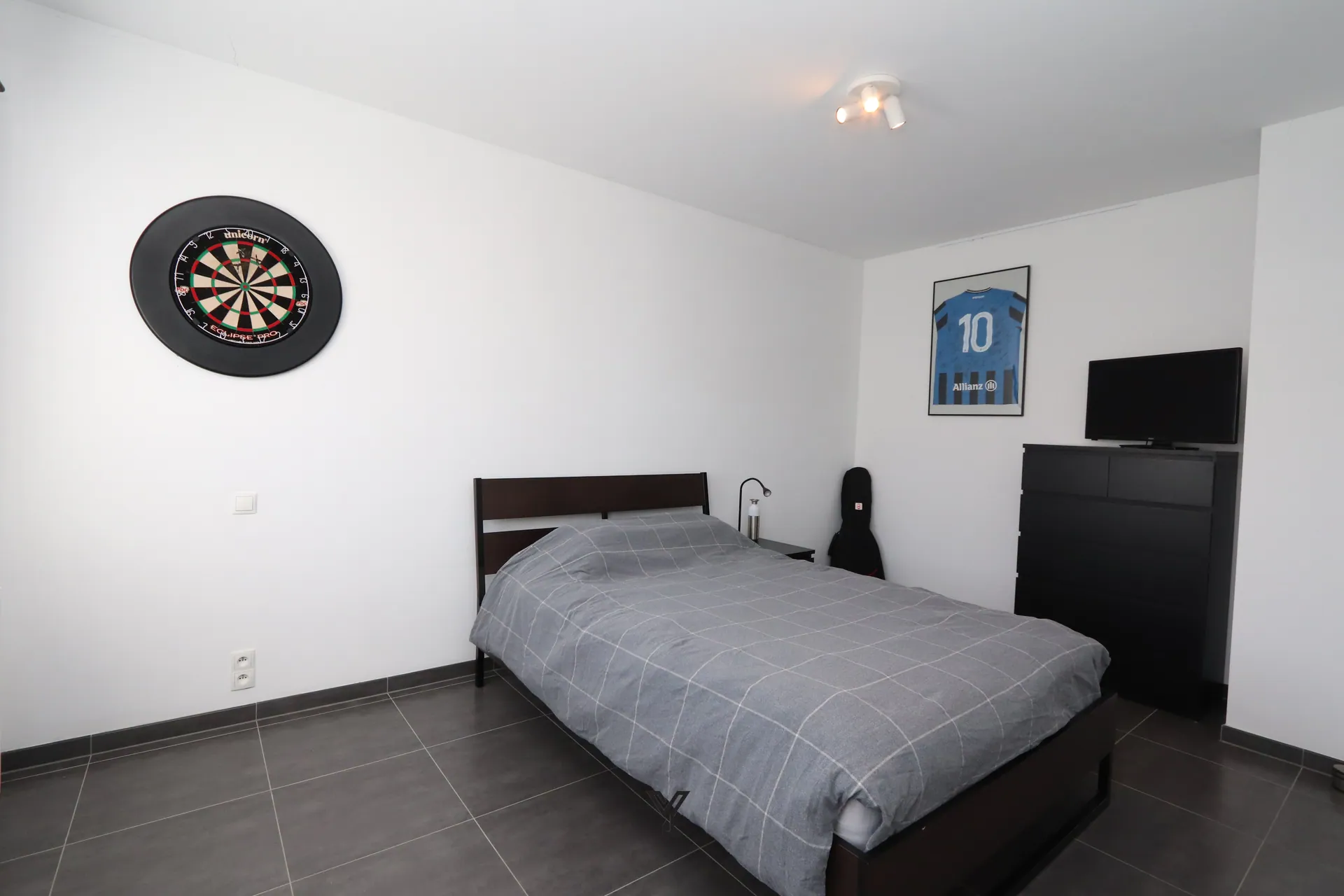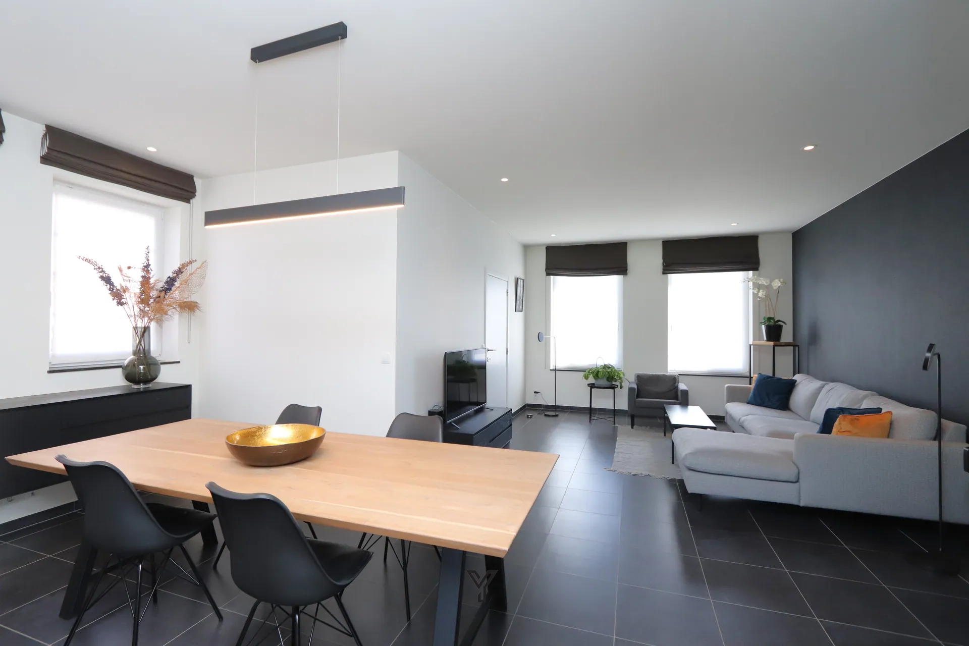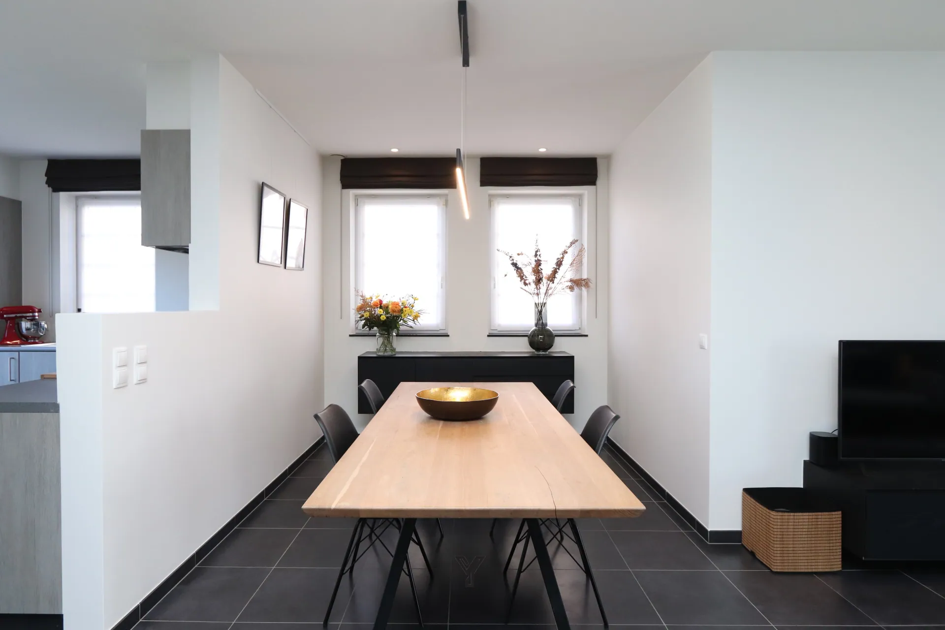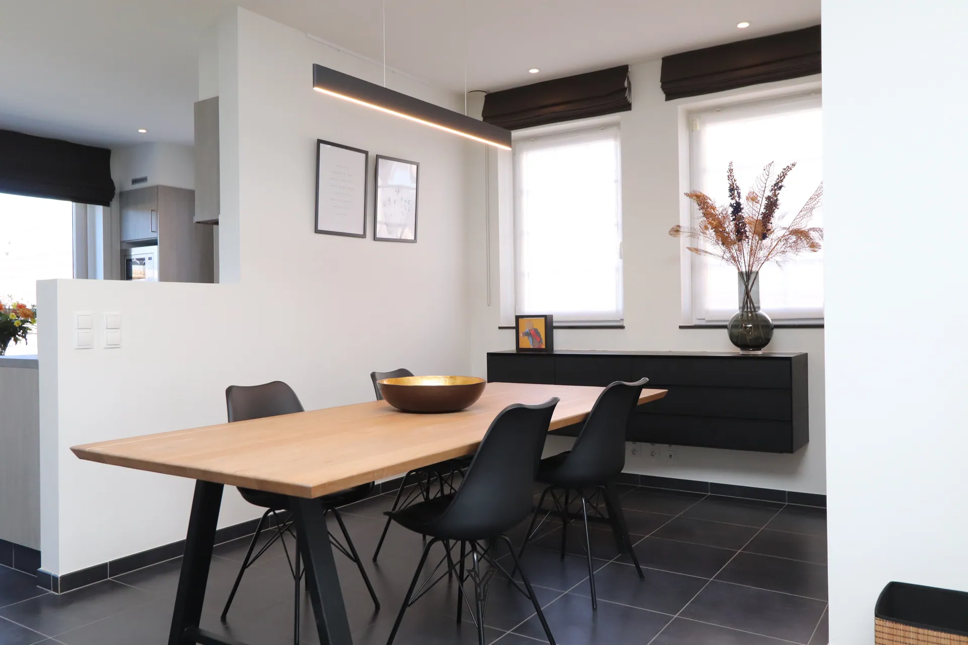 De lichtrijke leefruimte vormt het hart van de woning en biedt plaats voor een gezellige zithoek, eetruimte en bureauhoek. Dankzij het op maat gemaakte dressoirmeubel en het stijlvolle TV-meubel geniet u hier van zowel comfort als een strakke uitstraling.