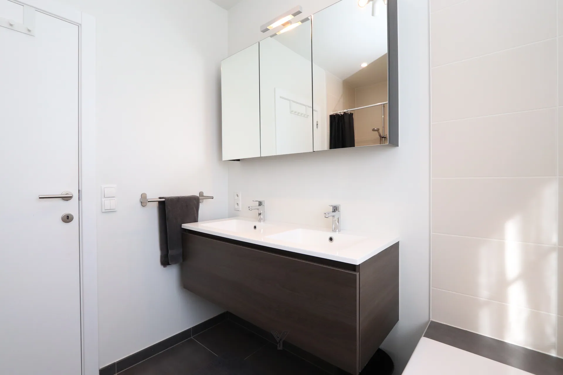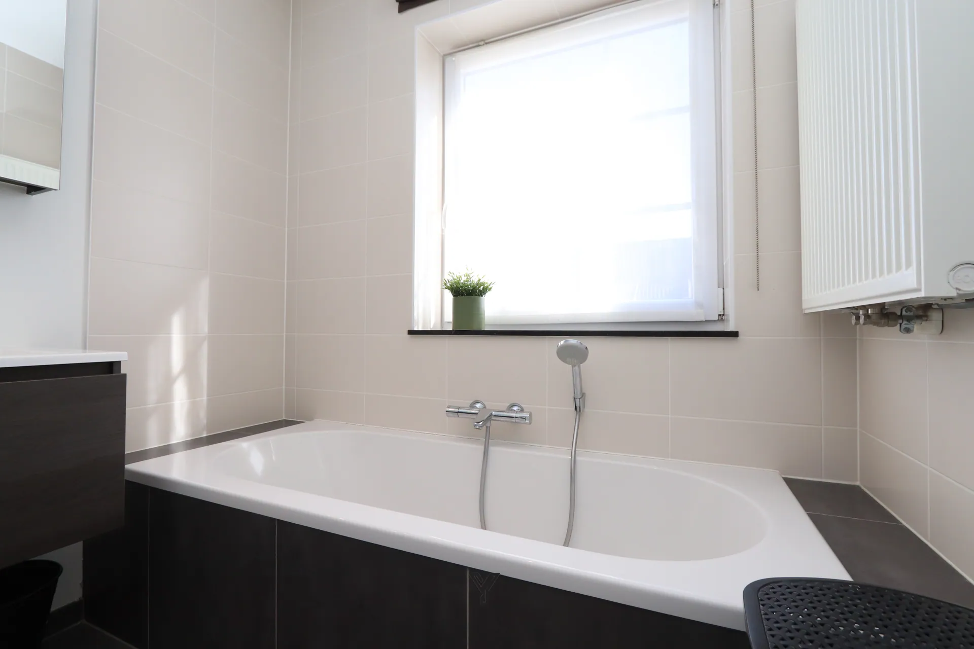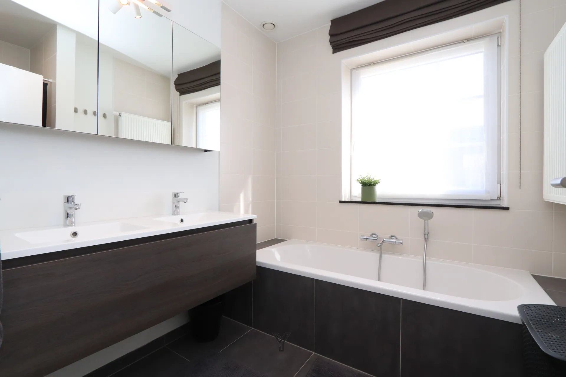 Badkamer met lavabo in meubel, douche en ligbad