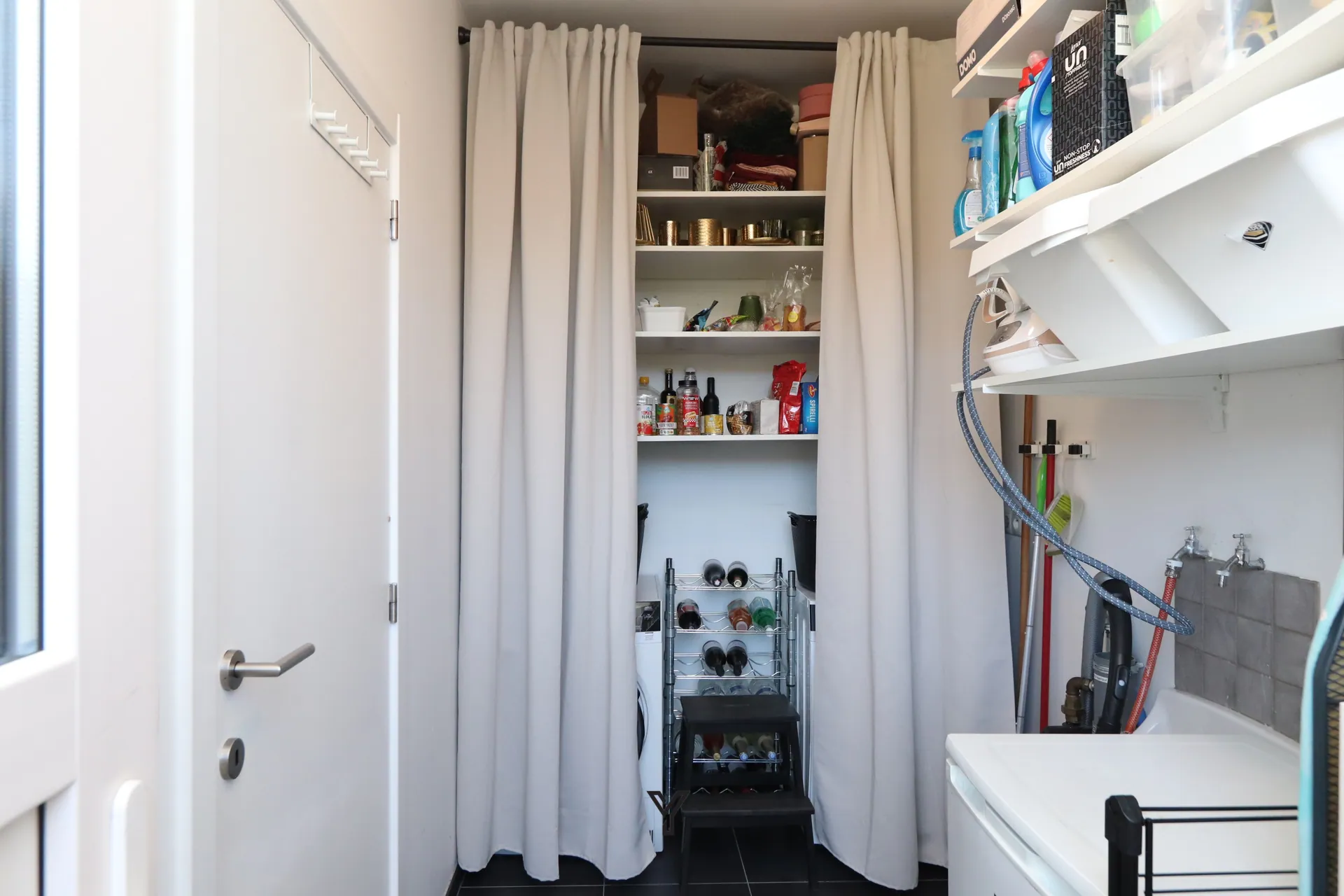 Op het gelijkvloers vindt u verder een ruime berging met aansluitingen voor wasmachine en droogkast, aangevuld met praktische opbergruimte/leggers.