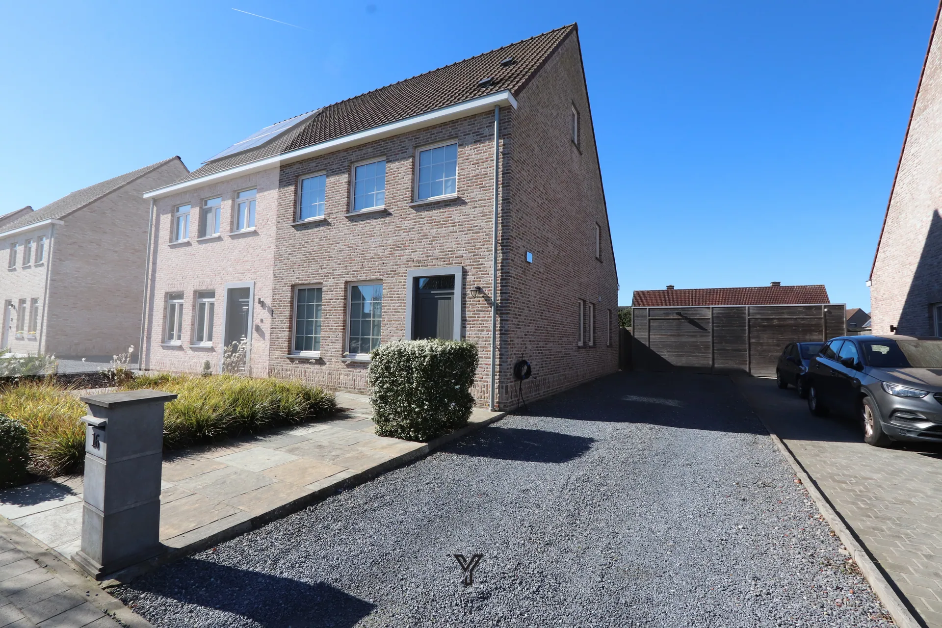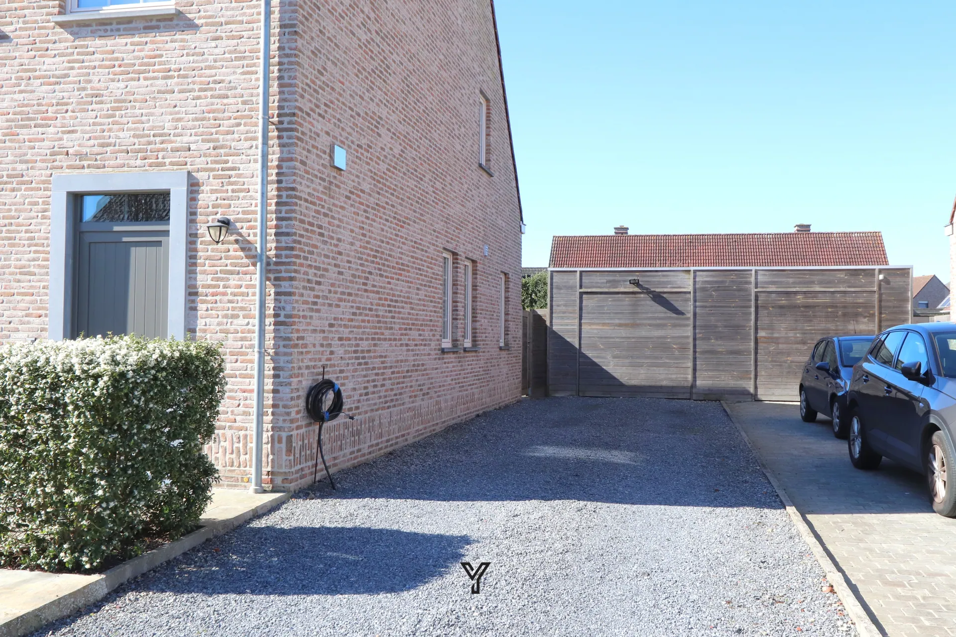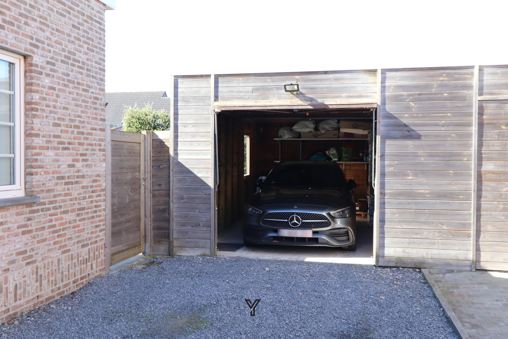 De woning beschikt over een garage (automatische poort) en meerdere parkeerplaatsen op het domein. Extra bergruimte is voorzien in de tuinberging.