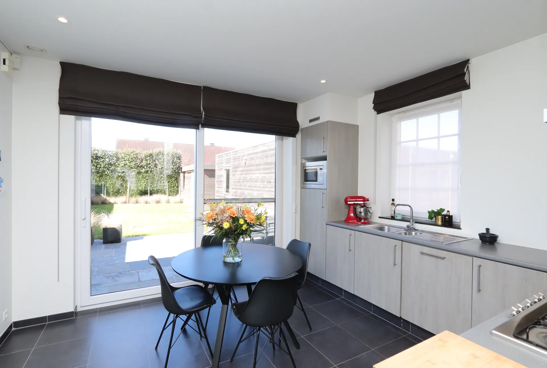 De moderne, volledig uitgeruste eetkeuken sluit naadloos aan en biedt een mooi zicht op de aangelegde tuin. Hier in de buitenruimte op het terras is het heerlijk vertoeven tijdens zonnige dagen en lange zomeravonden.