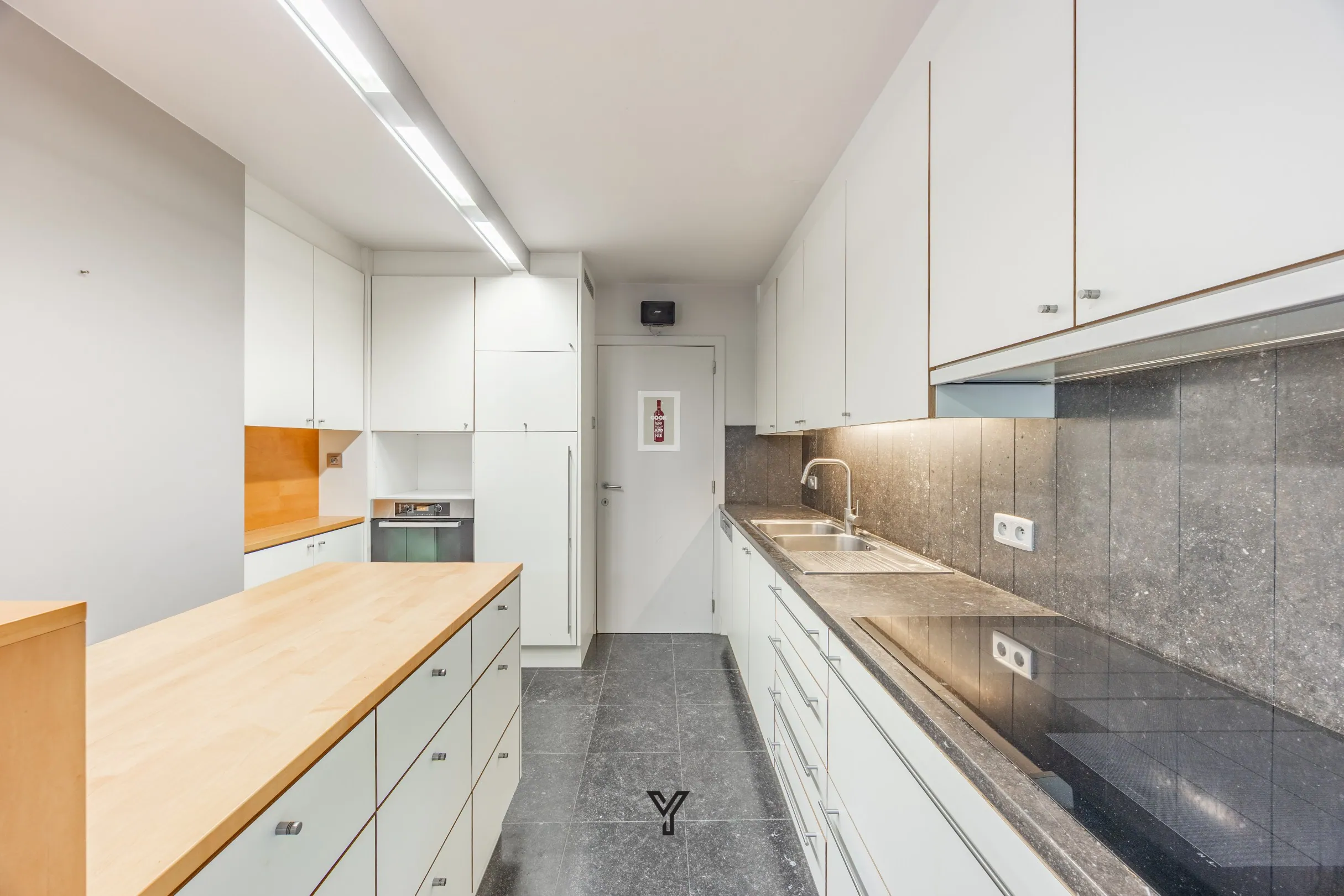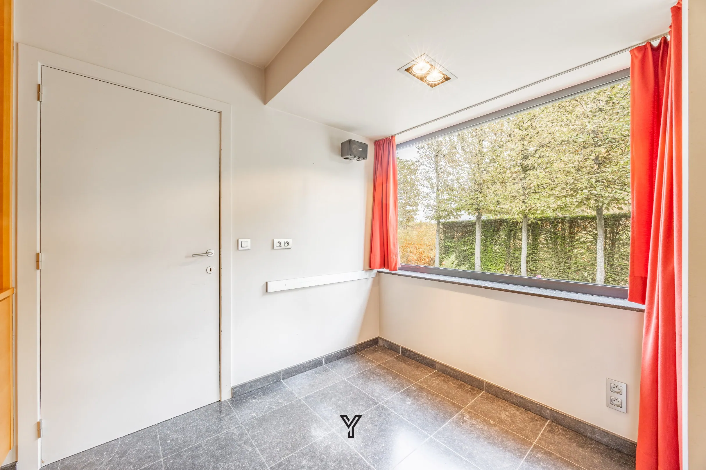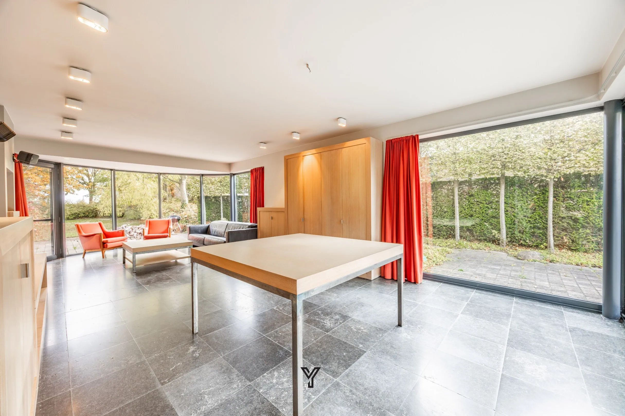 Binnenin verwelkomt de inkomhal met gastentoilet je stijlvol. Op het gelijkvloers bevindt zich een slaapkamer of bureauruimte, gevolgd door een lichtrijke leefruimte met natuurstenen vloer, kwalitatieve maatkasten en smaakvolle verlichtingsarmaturen. De grote ramen zorgen voor een prachtig zicht op de volwassen tuin rondom de woning.