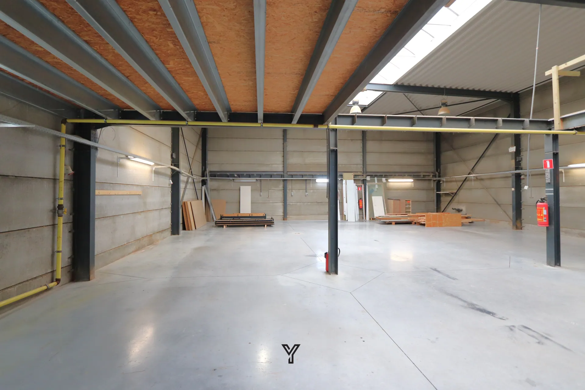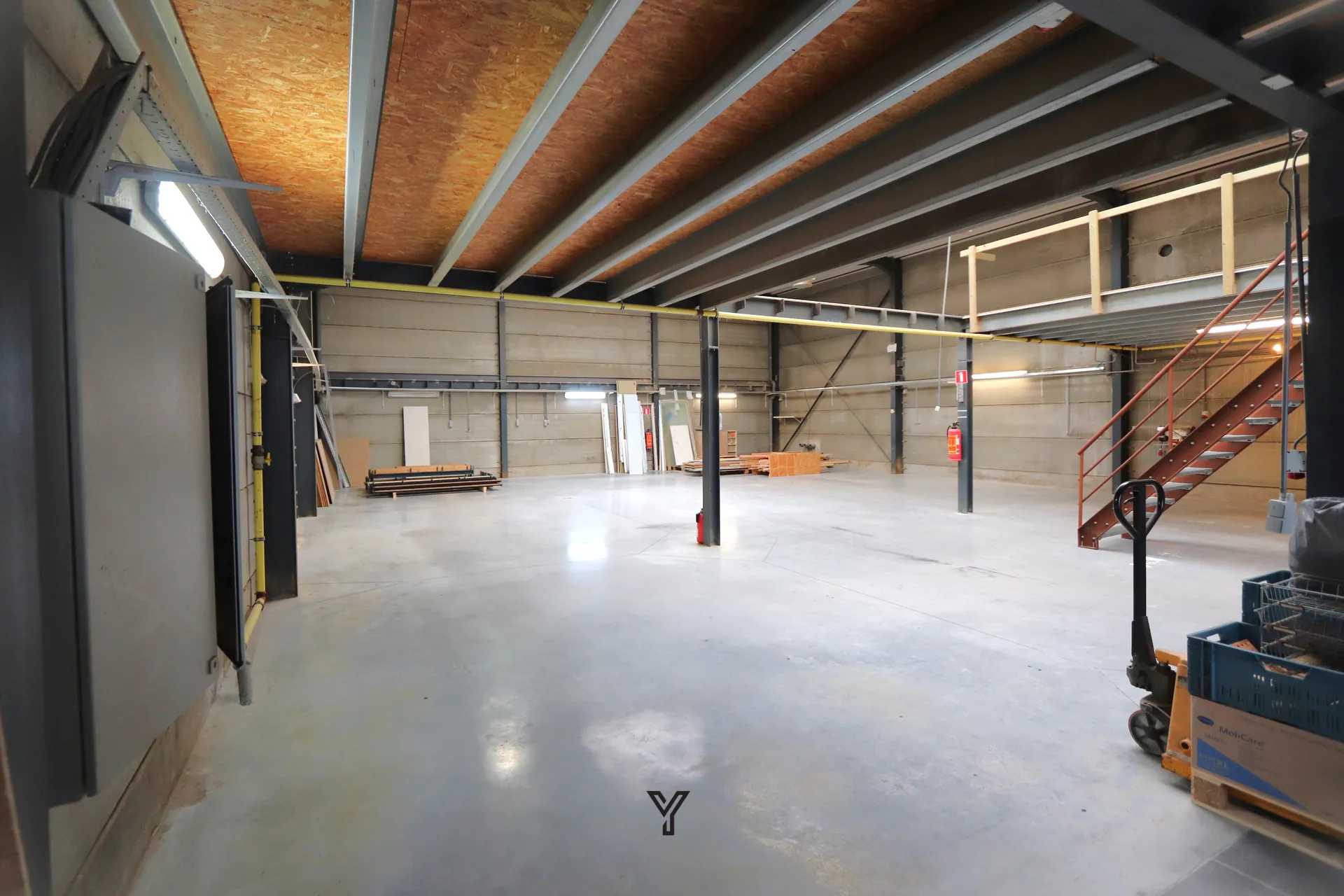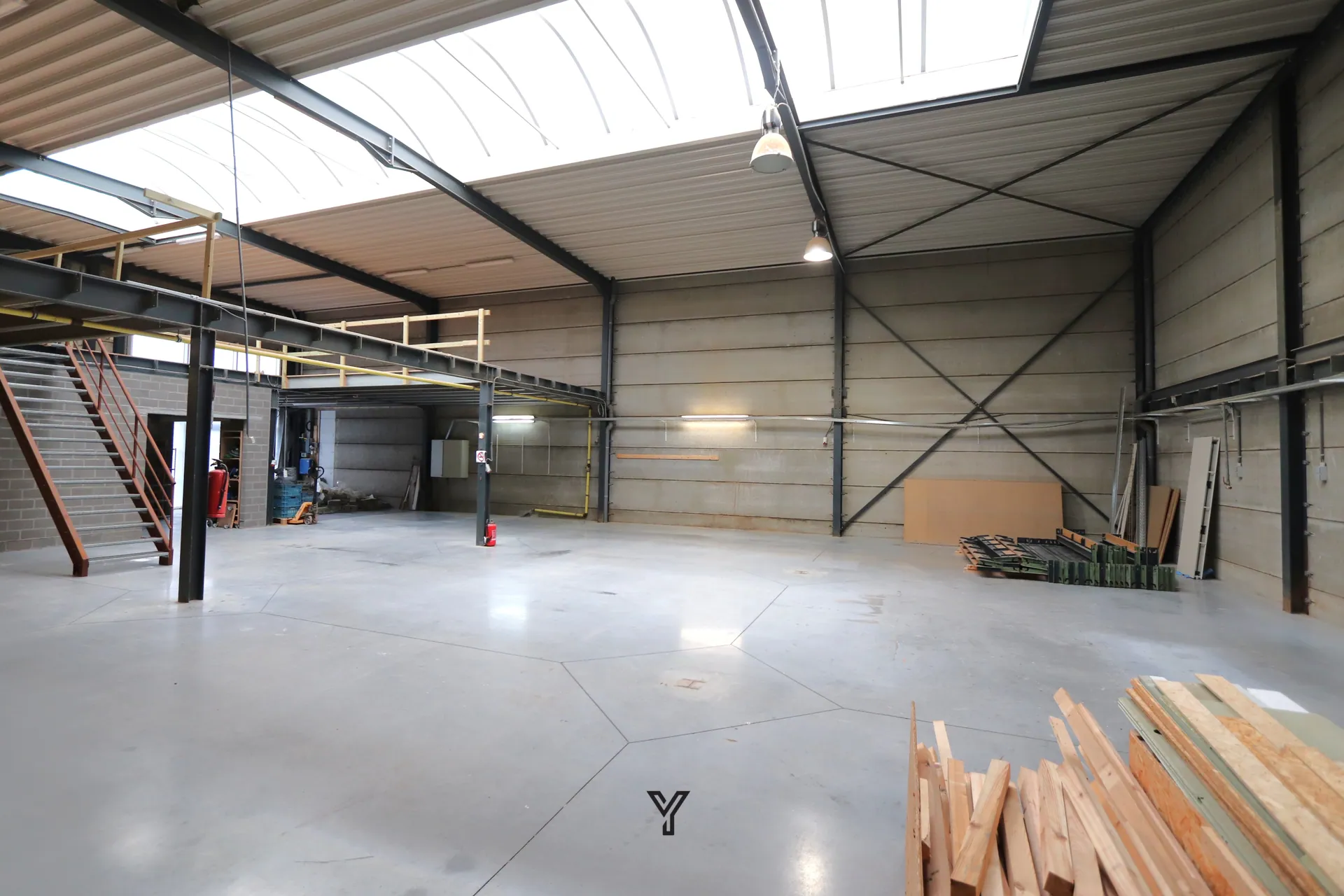 • Mezzanine: ca. 80 m² op 3,3m hoogte via trap: deze kan verplaatst worden in de ruimte