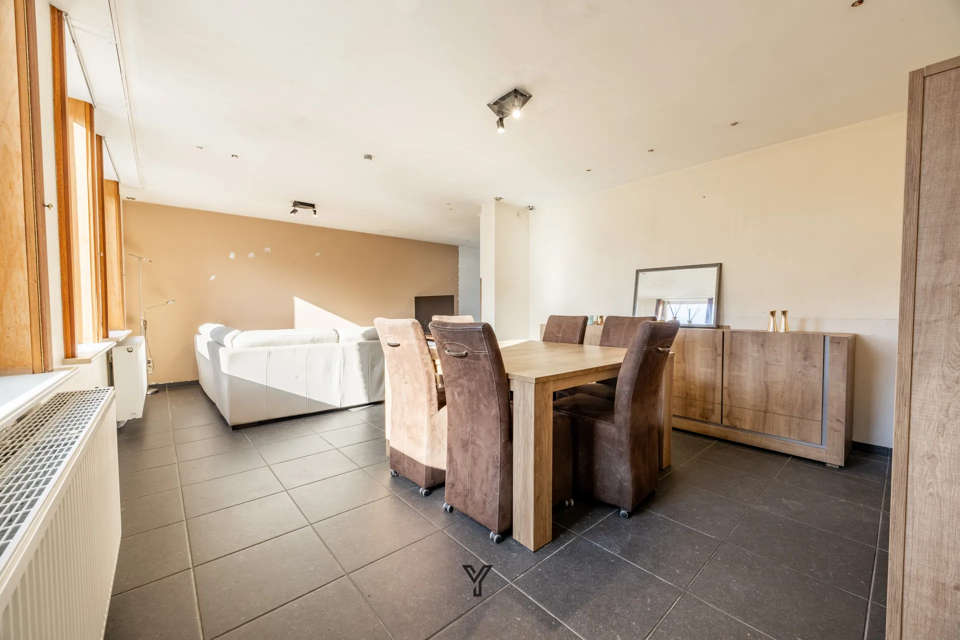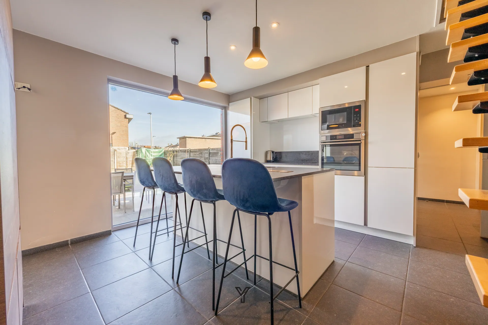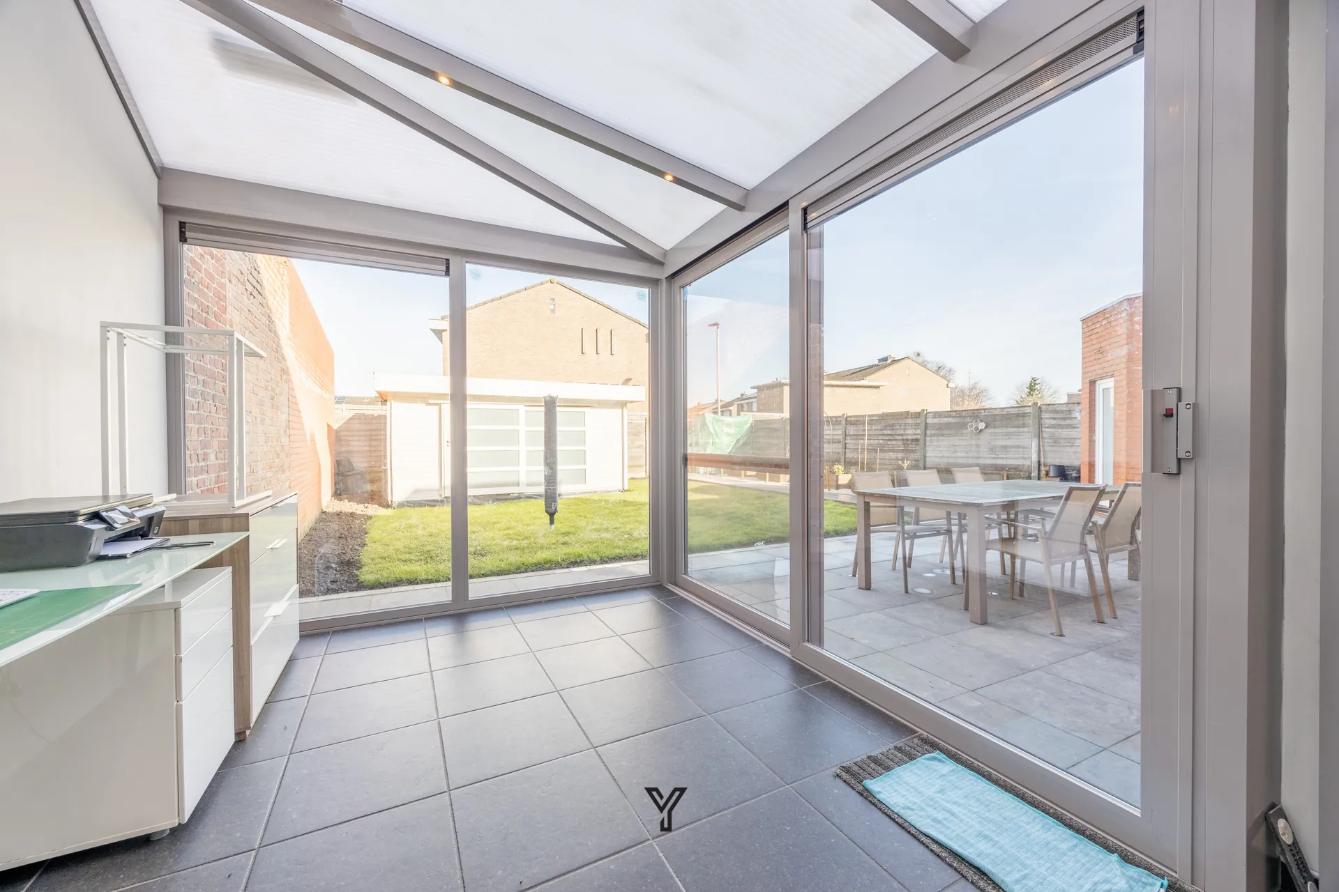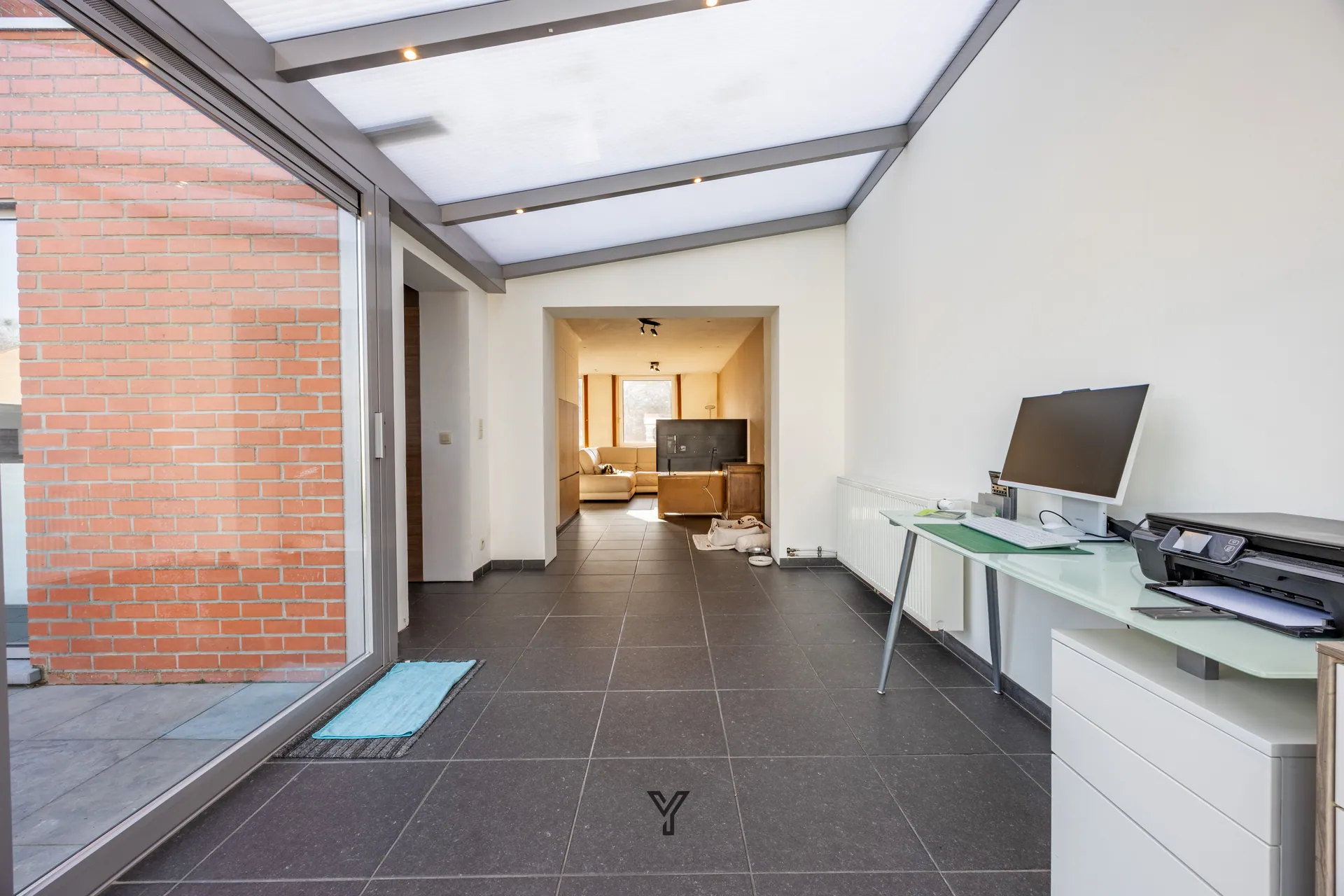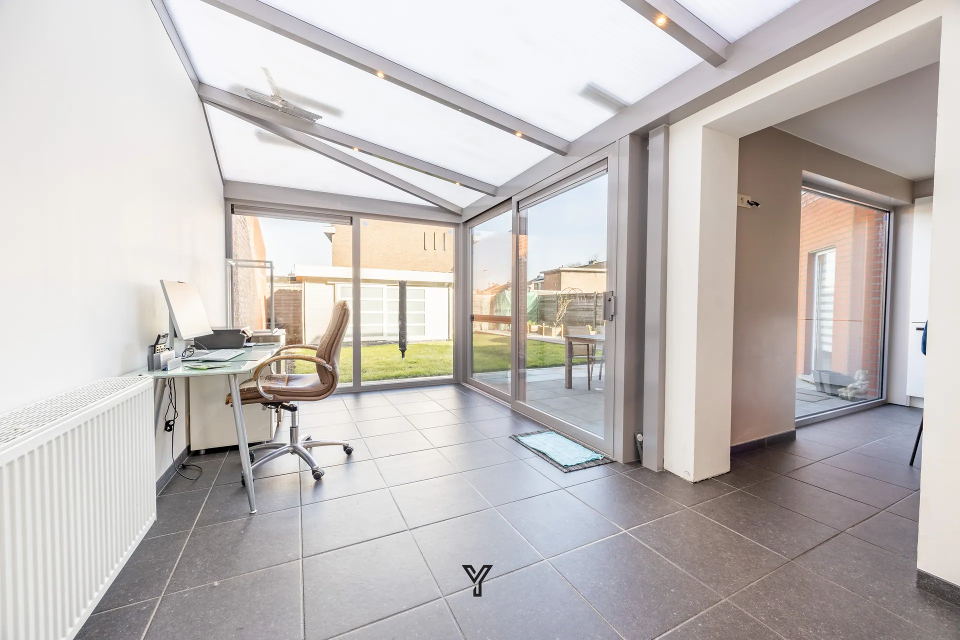 Aansluitend bevindt zich de veranda, waar u geniet van een prachtig zicht op de volledig aangelegde en verzorgde tuin. De open connectie met de vernieuwde keuken zorgt voor een aangename flow in de woning. De keuken is uitgerust met alle hedendaagse toestellen en beschikt over een praktisch kookeiland waar ook gezellig kan getafeld worden.