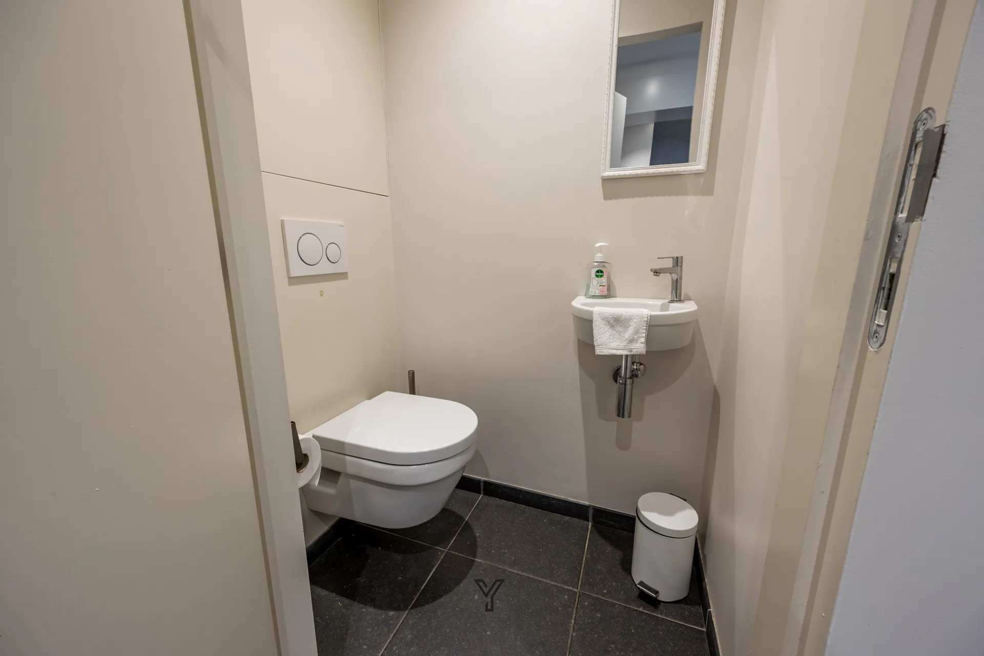 De gelijkvloerse verdieping wordt vervolledigd door een gastentoilet, een wasberging en een extra ruimte met tal van mogelijkheden (bureau, praktijk, hobbyruimte…).