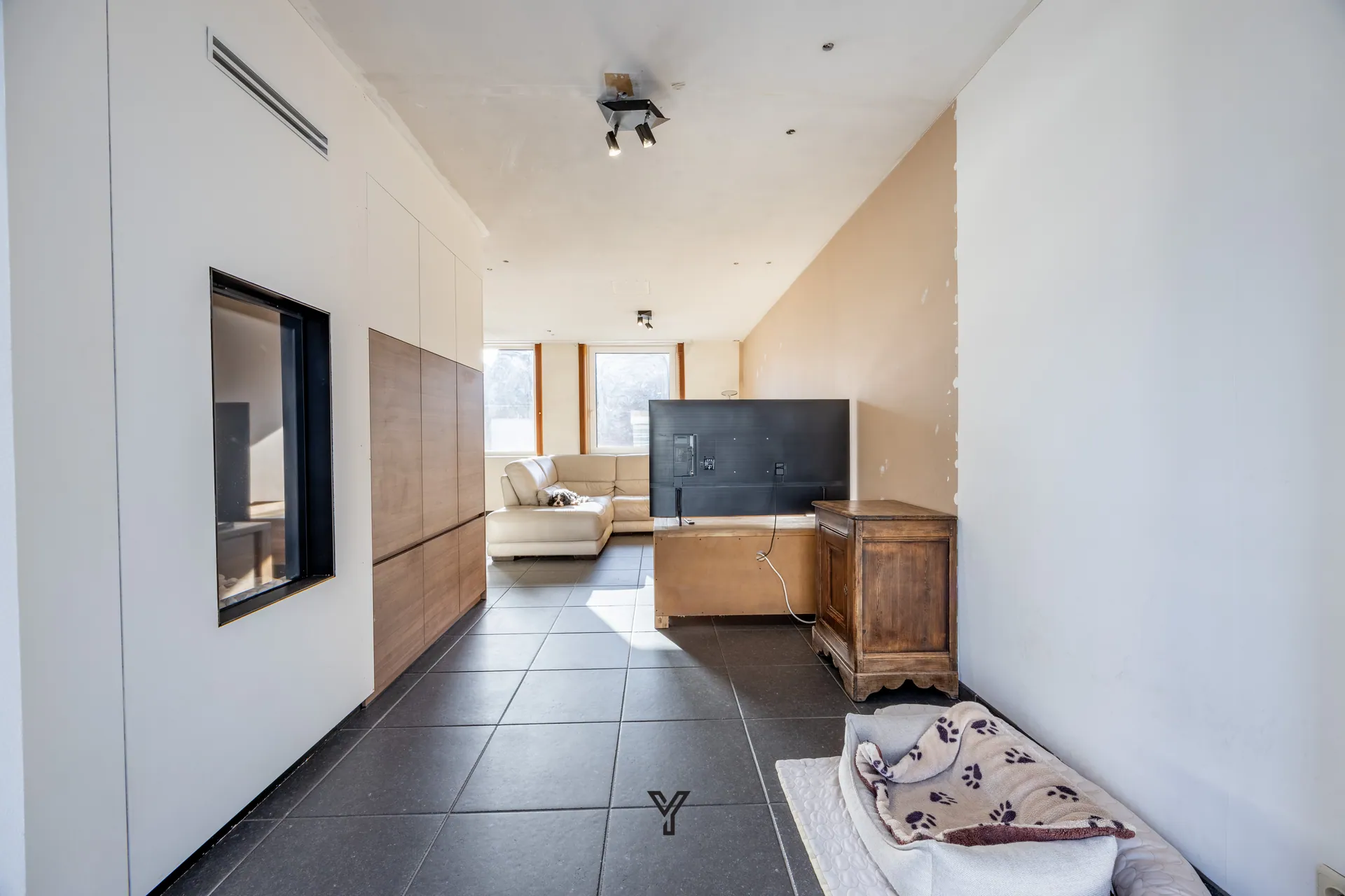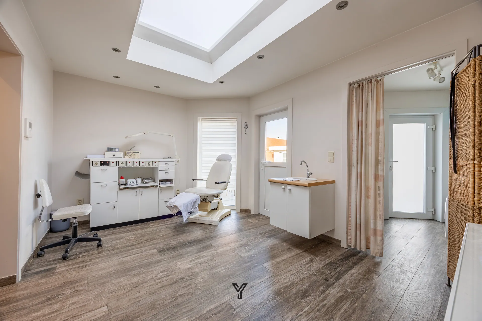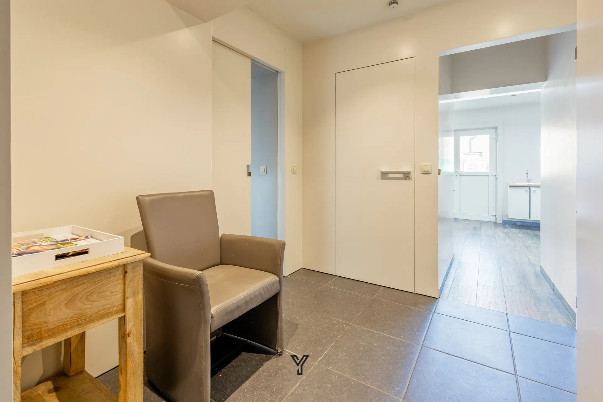 Via de inkomhal met maatkasten krijgt u toegang tot zowel het woongedeelte als de gelijkvloerse praktijkruimte. De lichtrijke leefruimte biedt plaats voor een gezellige zit- en eetkamer en wordt extra sfeervol gemaakt door de doorkijk-gashaard en ingebouwde maatkasten.