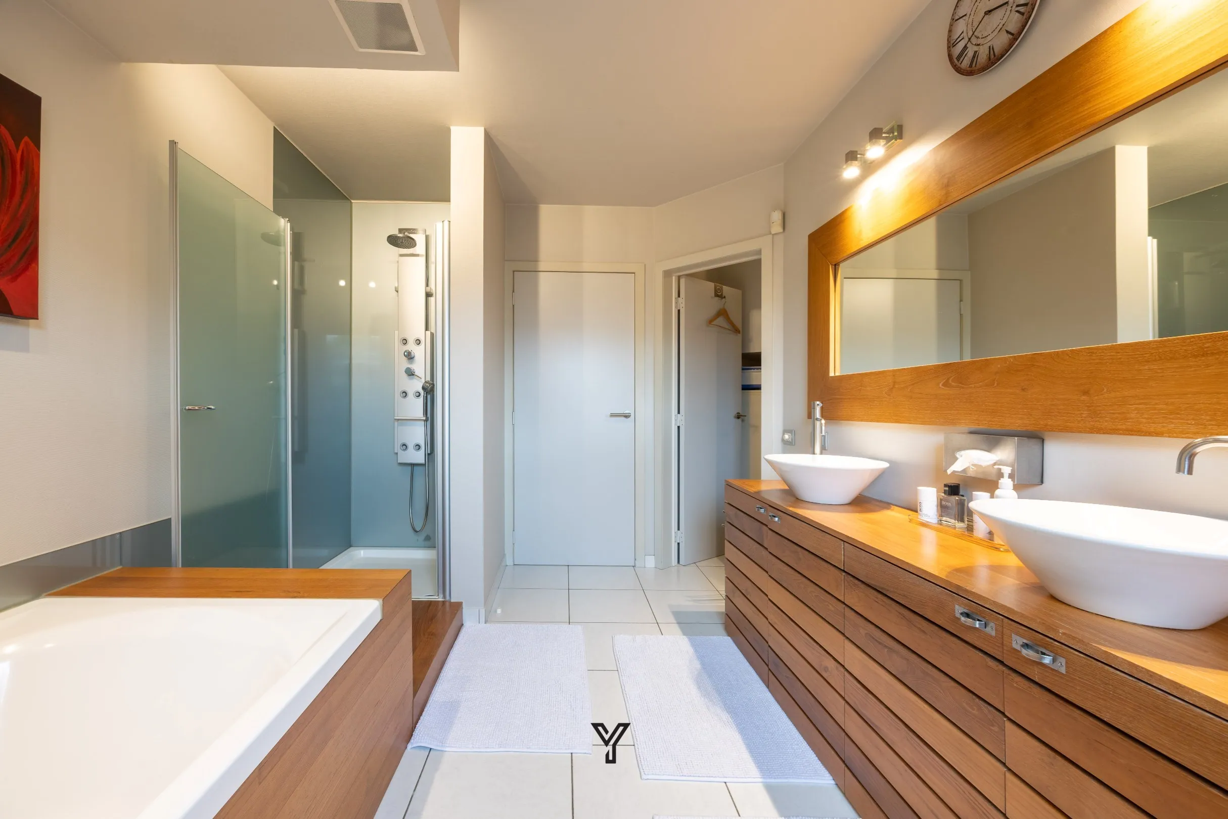 Badkamer met inloopdouche, ligbad en dubbele lavabo in meubel