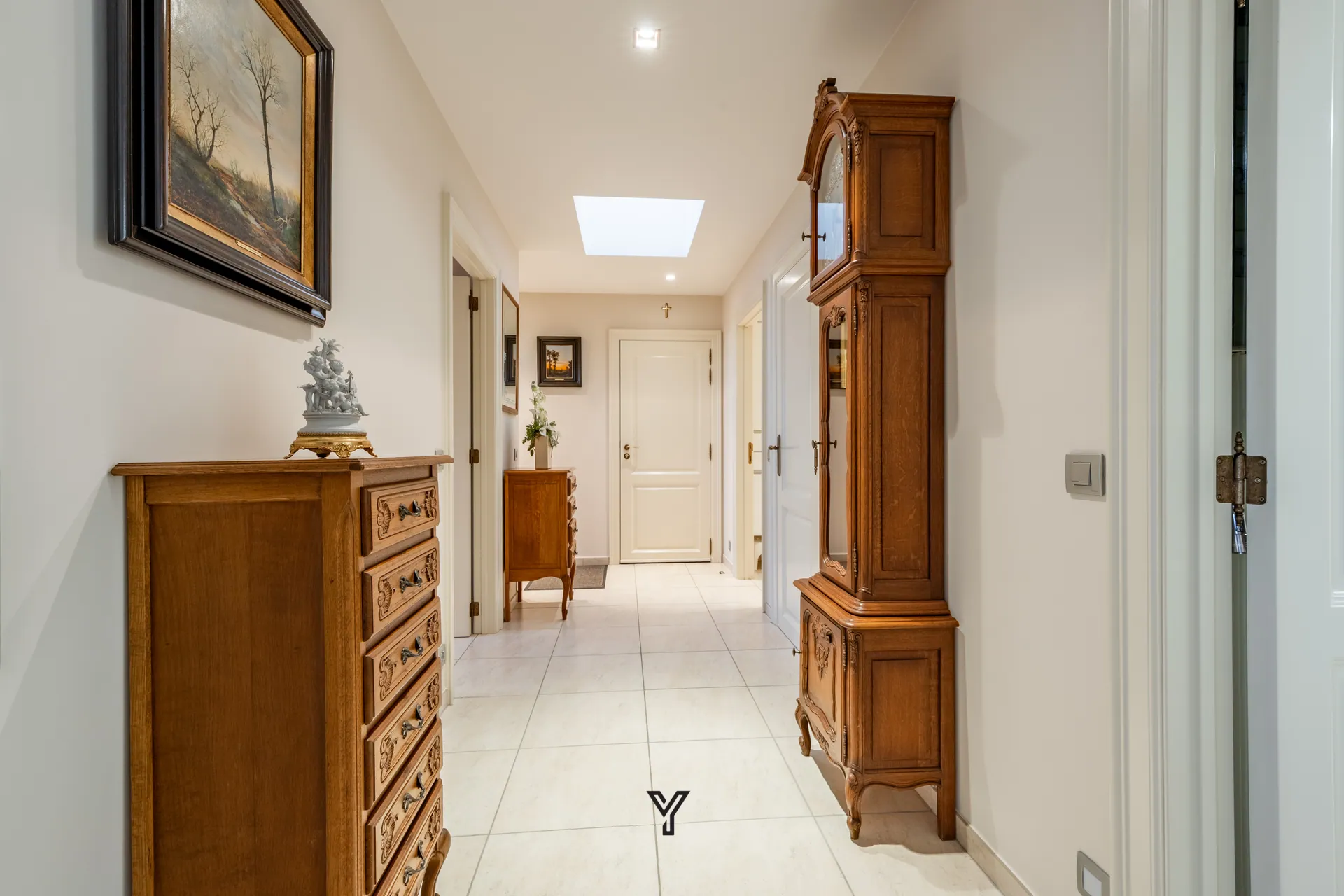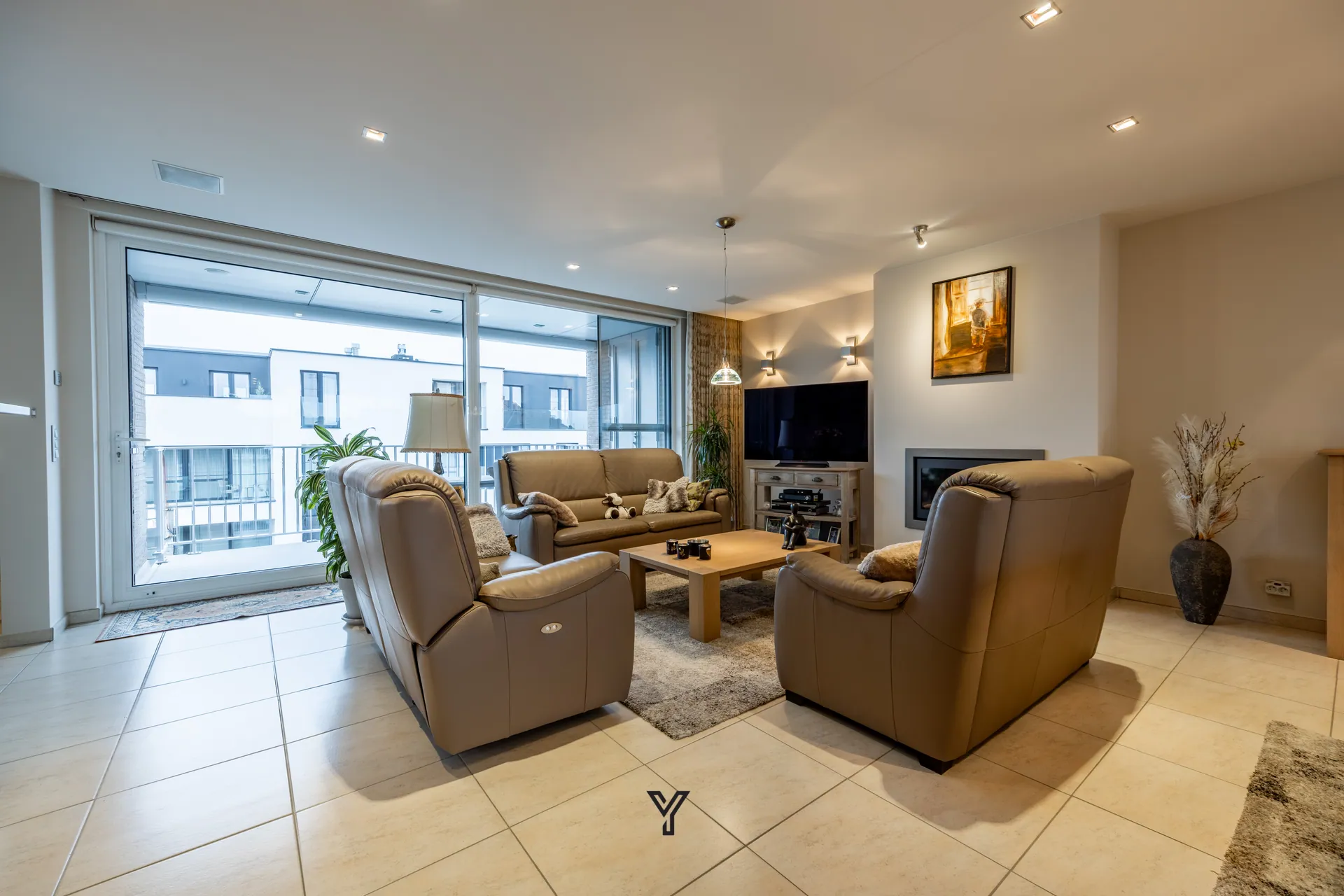 Stap binnen via de royale inkomhal met gastentoilet en laat je leiden naar de indrukwekkende lichtrijke woonkamer met volledig uitgeruste keuken. Hier vormen ruimte, licht en elegantie het perfecte decor voor gezellige avonden bij de stijlvolle gashaard – het kloppend hart van dit exclusief appartement.
