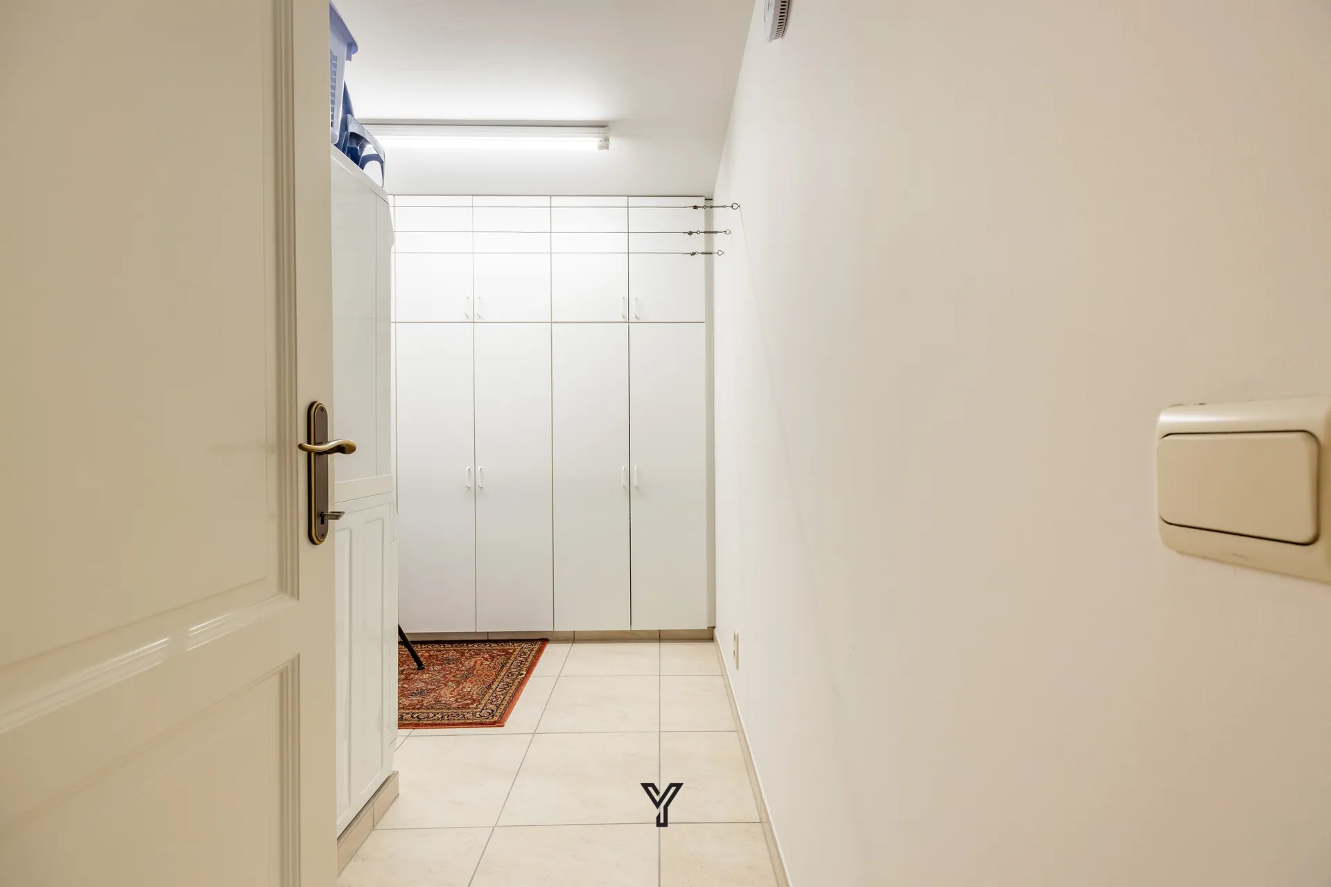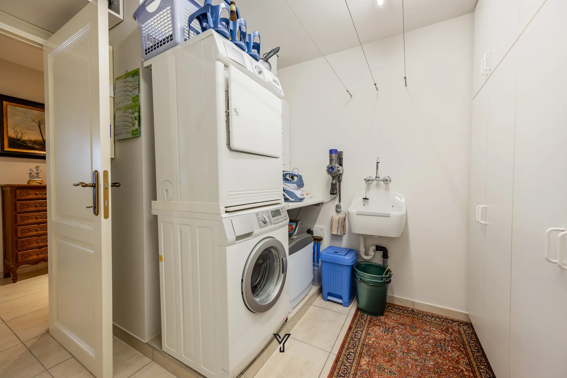 De praktische berging met ingemaakte kasten en aansluiting voor wasmachine en droogkast biedt extra comfort en opbergruimte.