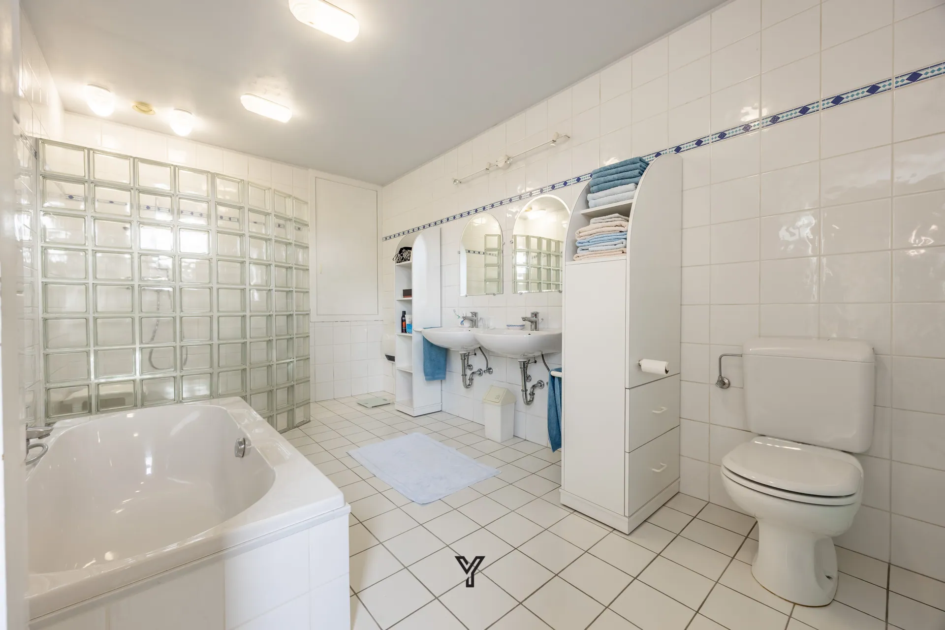 Badkamer met dubbele lavabo, douche en ligbad