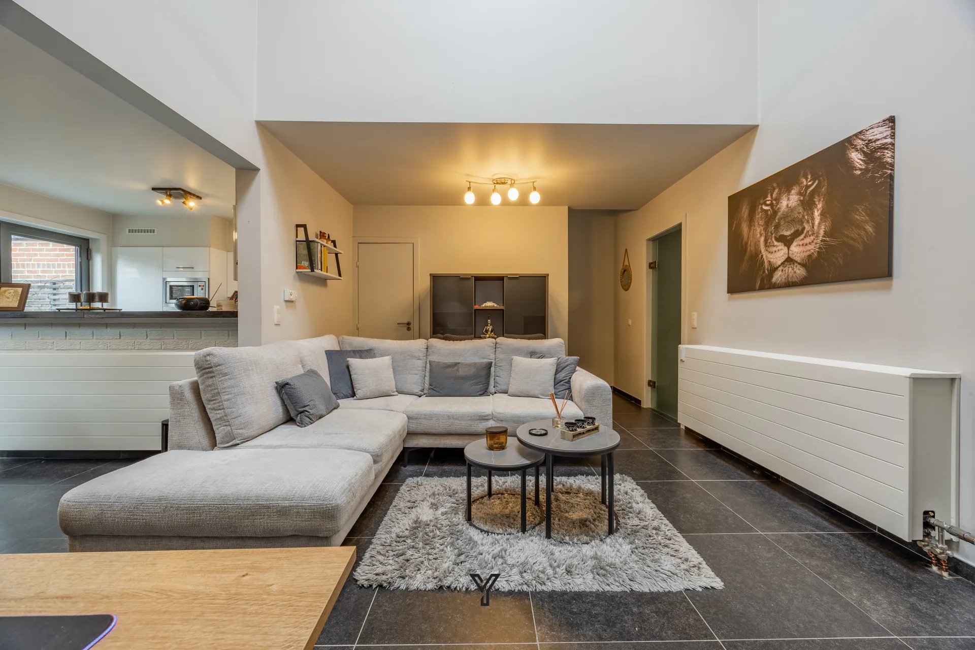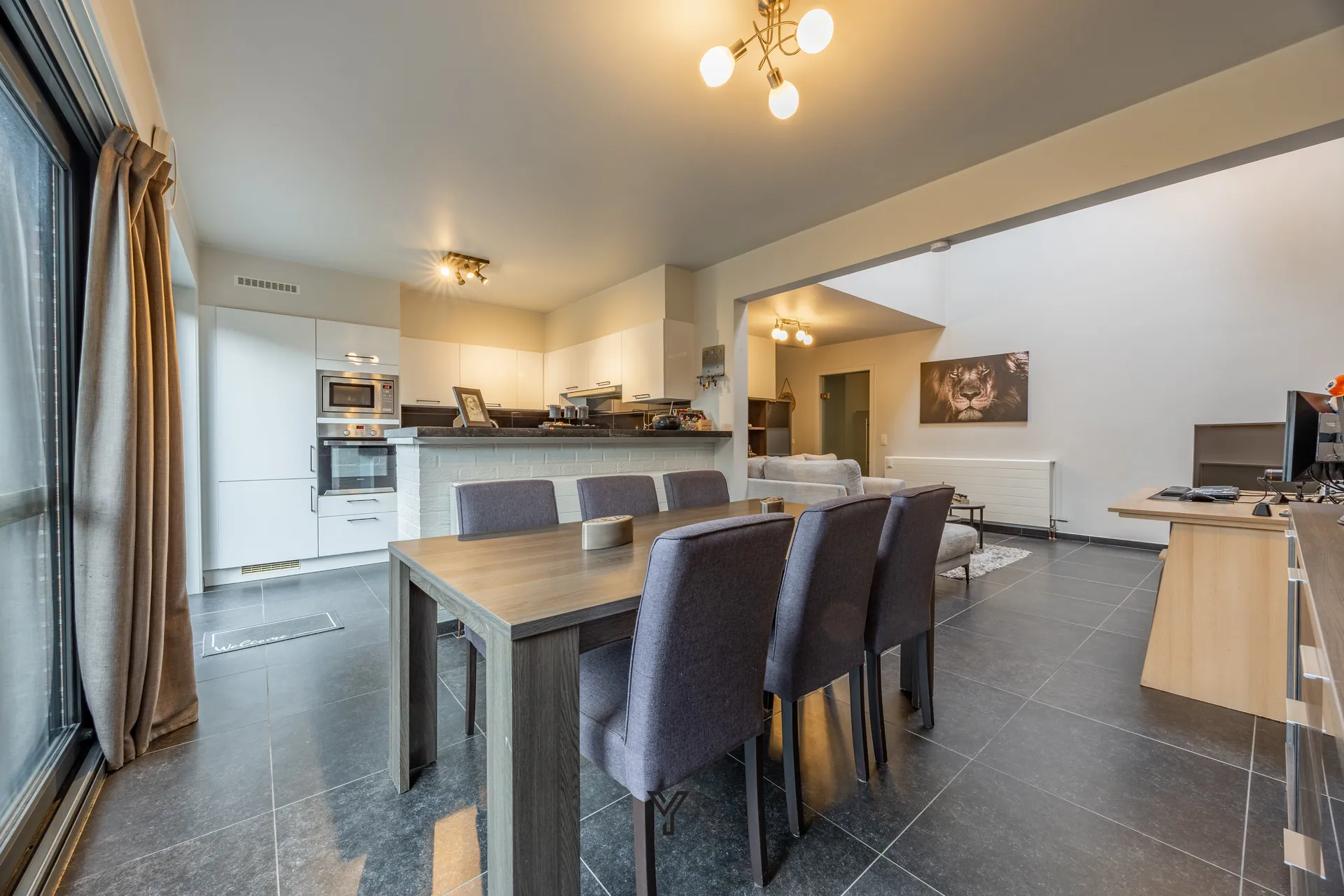 De lichtrijke leefruimte vormt het warme hart van de woning en biedt plaats aan een royale zithoek en een uitnodigende eethoek die naadloos in elkaar overvloeien. Aansluitend bevindt zich de open keuken, perfect geïntegreerd en ideaal voor gezellige familiemomenten.