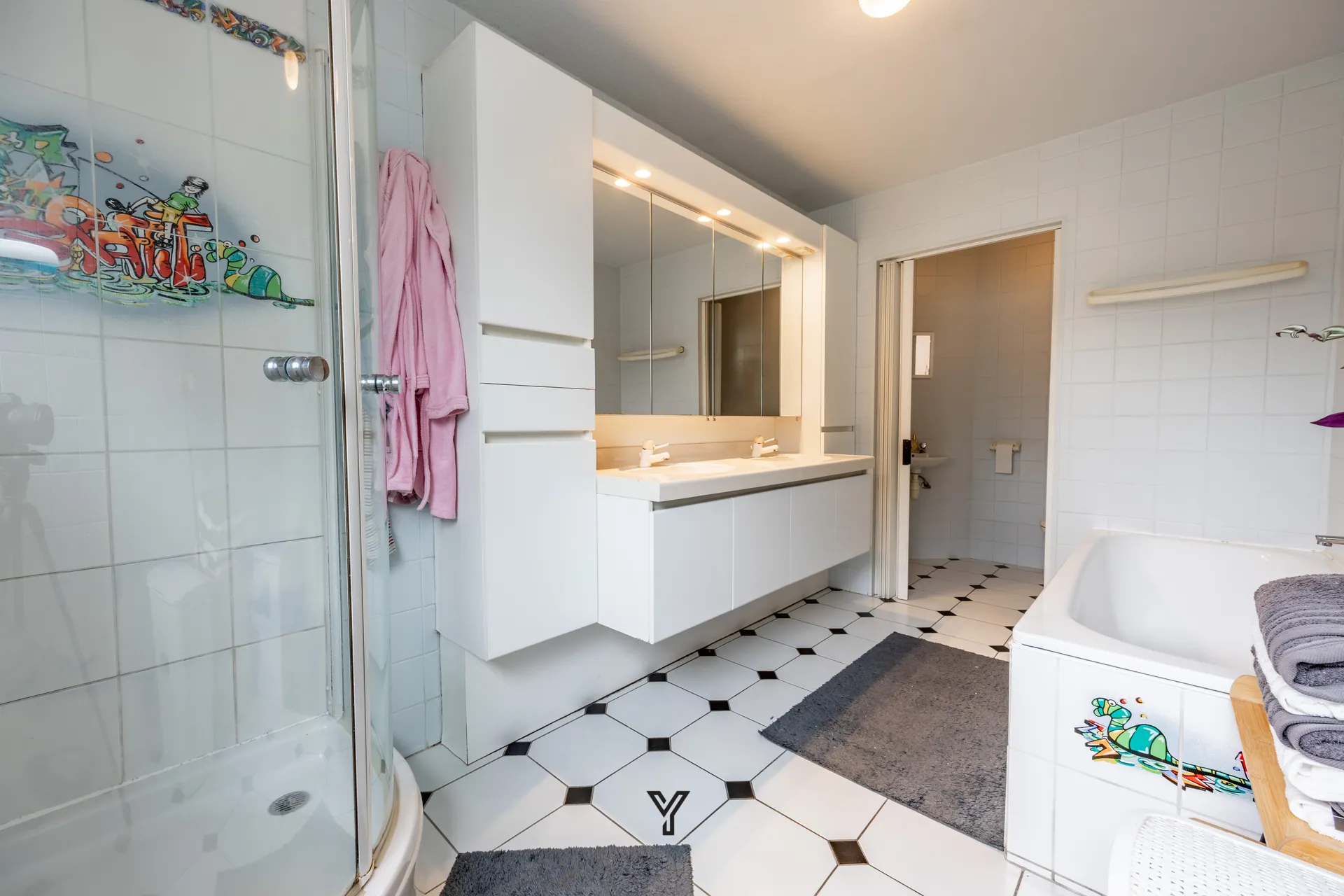 Badkamer met dubbele lavabo in meubel, instapdouche ne ligbad