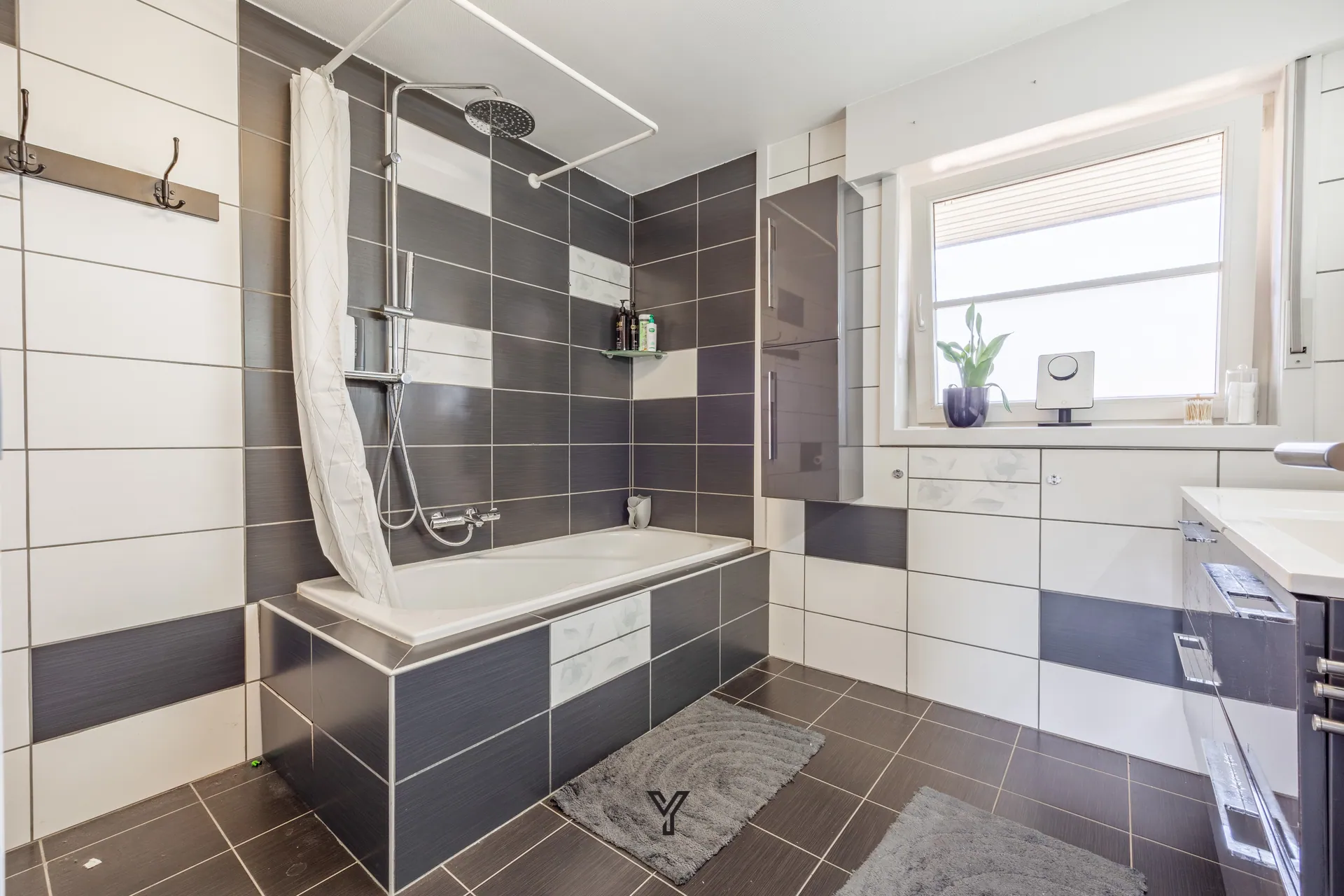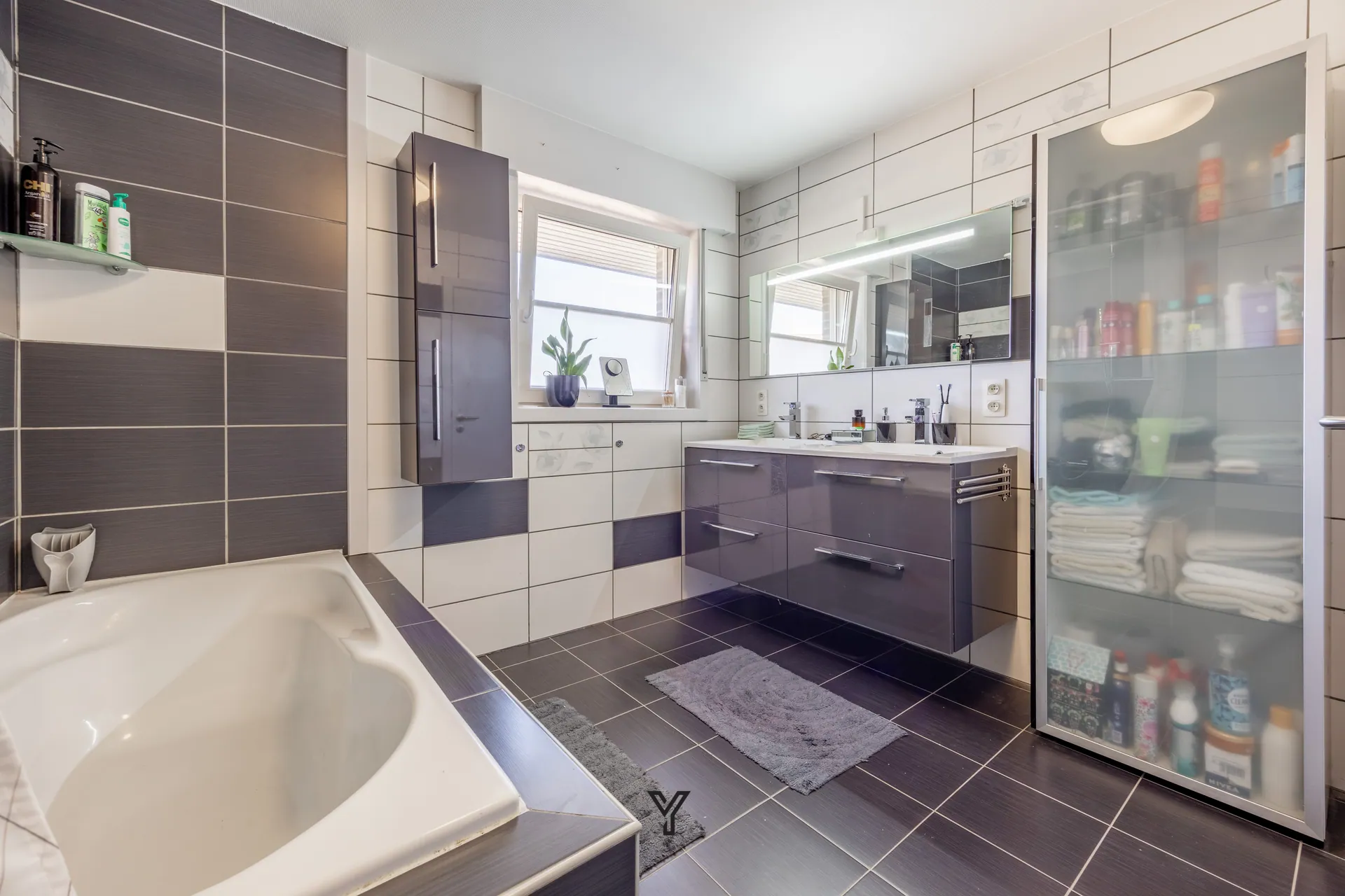 Dubbele lavabo in meubel, ligbad met douchemogelijkheid, toilet