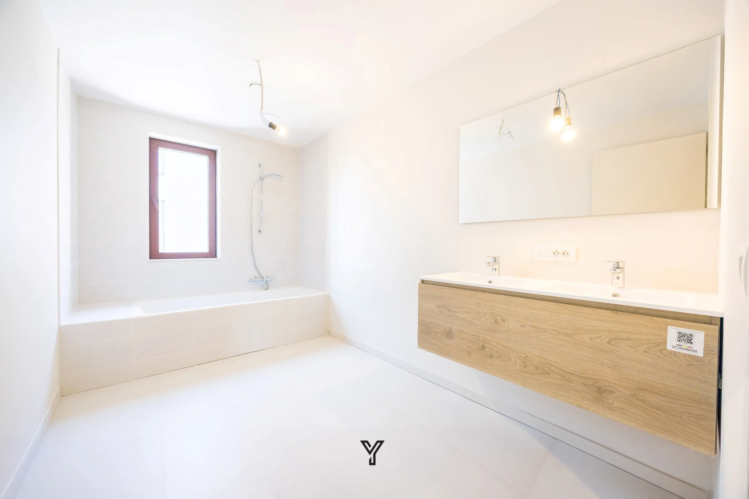 Badkamer met dubbele lavabo in meubel en ligbad