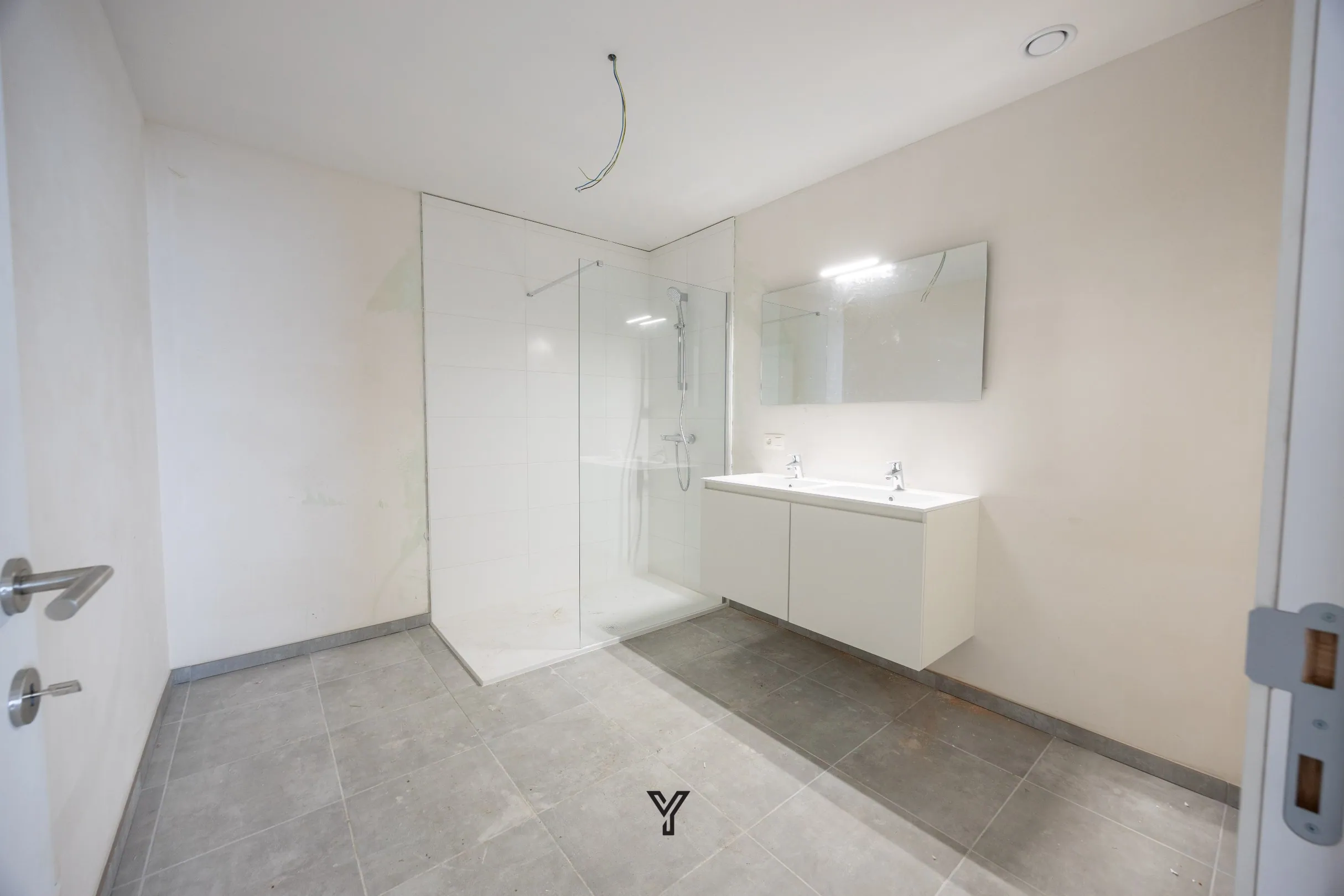 Badkamer met dubbele lavabo in meubel en inloopdouche