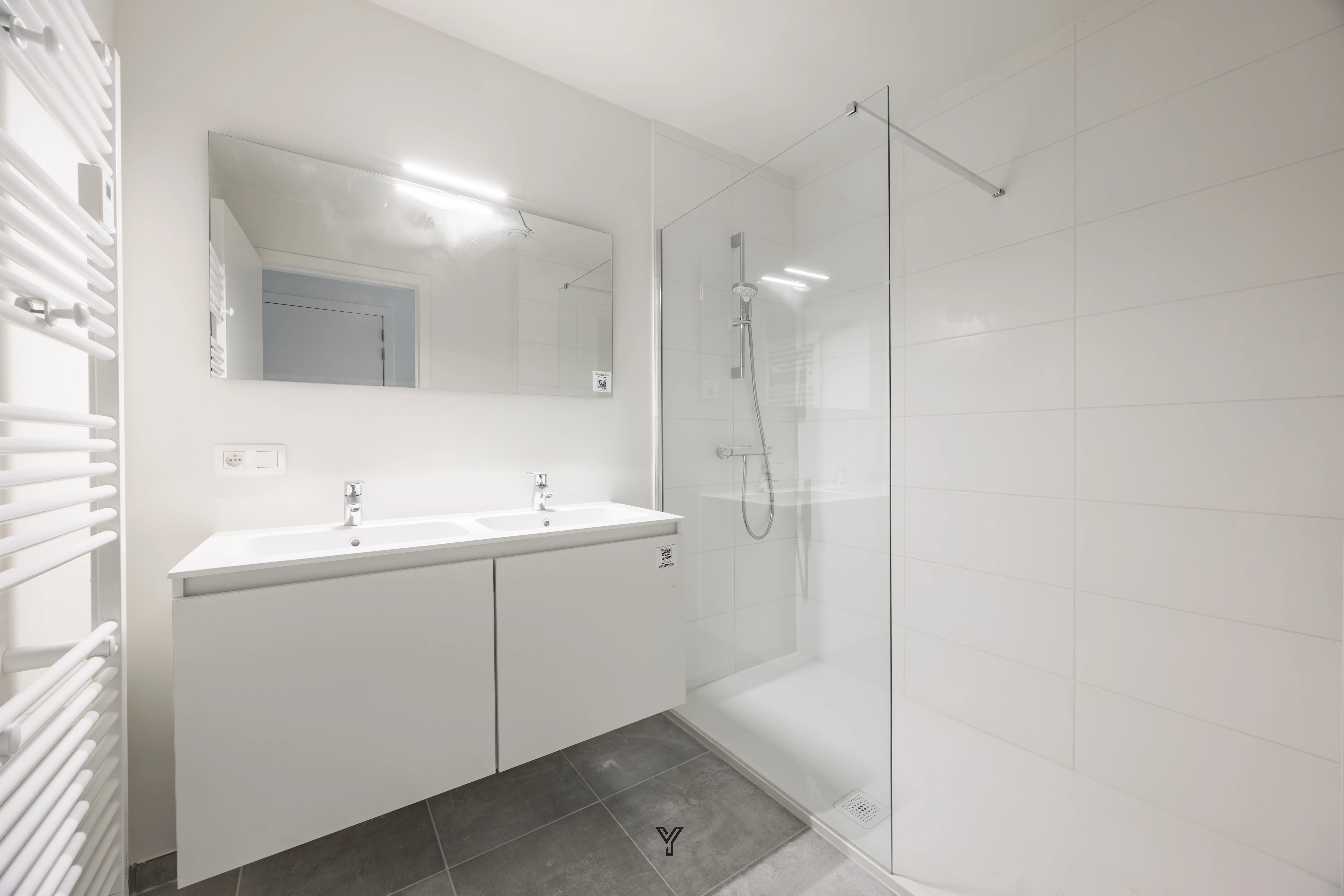 Badkamer met dubbele lavabo in meubel en inloopdouche
