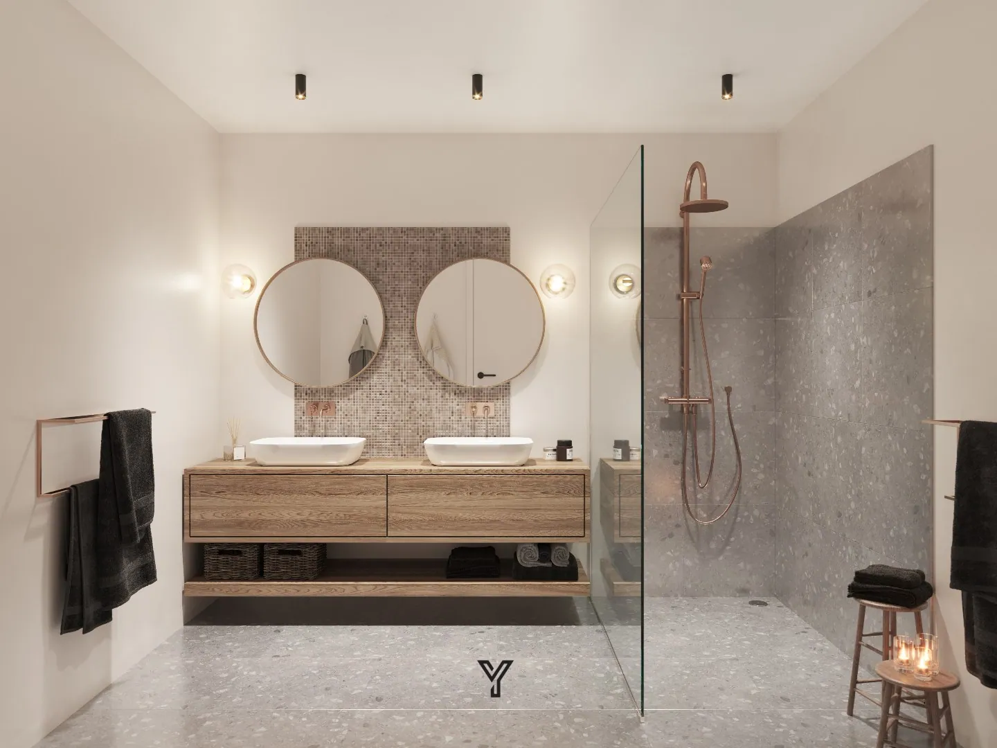 Badkamer met dubbele lavabo in meubel, inloopdouche