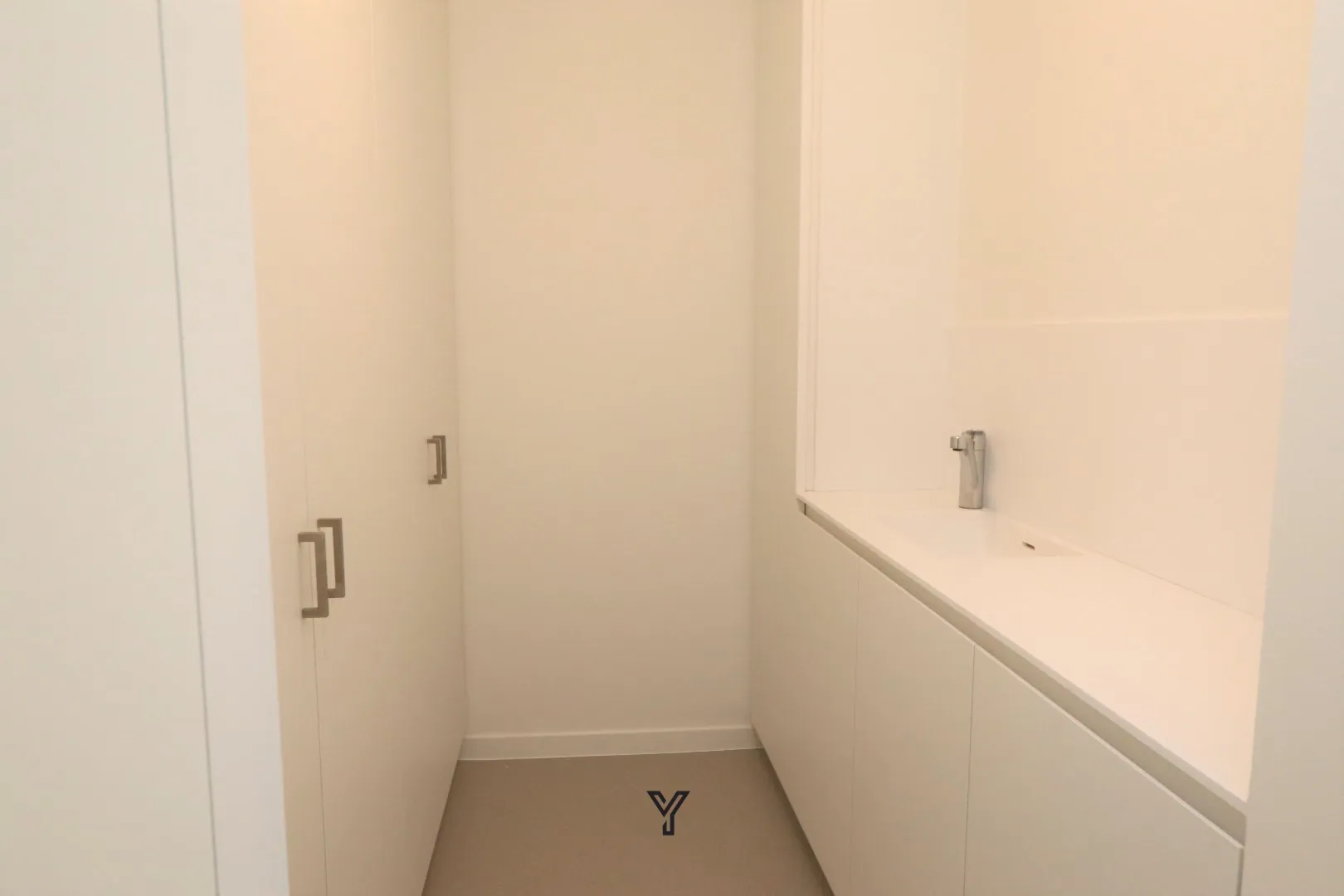 een praktische opbergruimte met ingebouwde kasten en kitchenette