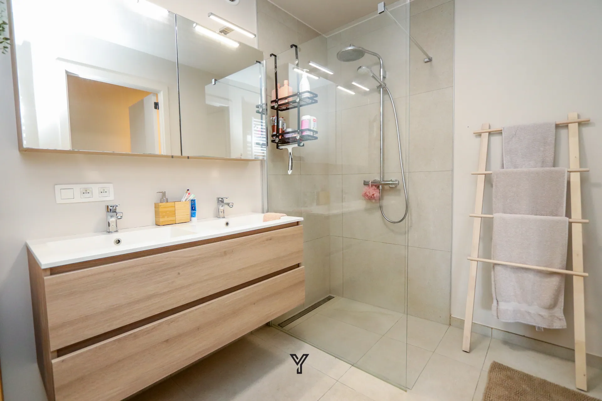 Badkamer met dubbele lavabo in meubel en inloopdouche